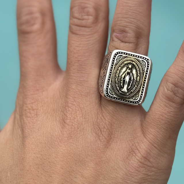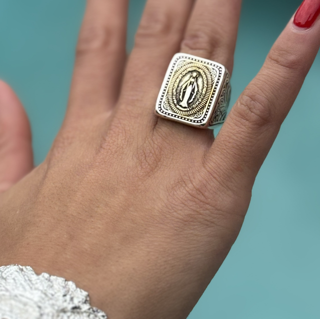 Lleva tu fe con fuerza y estilo. Este imponente anillo tipo sello destaca por su diseño rectangular y el detallado relieve de la Virgen, convirtiéndolo en una pieza protagonista. Es la combinación perfecta entre un amuleto de protección y un accesorio de moda audaz para usar todos los días.