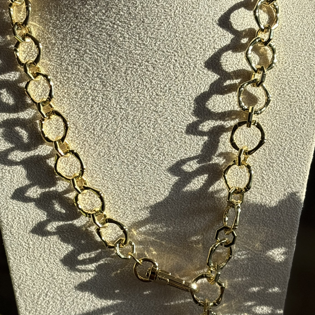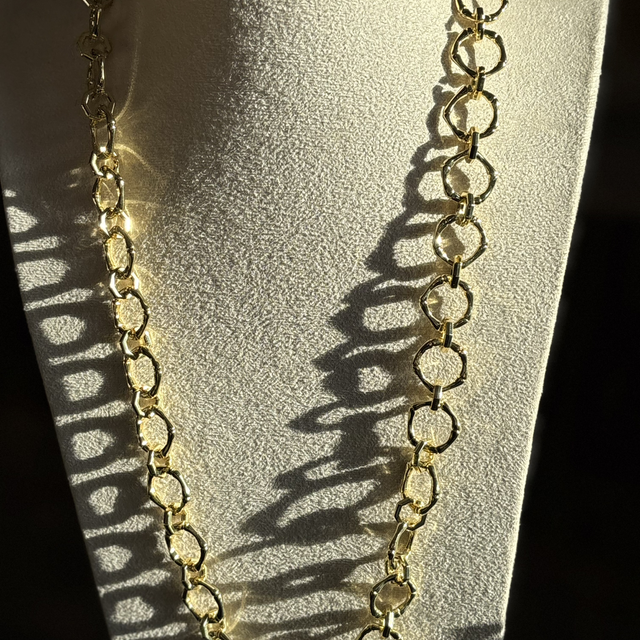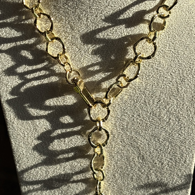 • Materiales: Cadena de eslabones con textura orgánica y acabado completo en enchape de oro de alto brillo.