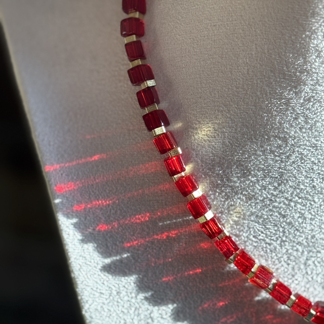 Materiales: Cristales en corte cubo de color rojo intenso y detalles intermedios en chapa de oro.