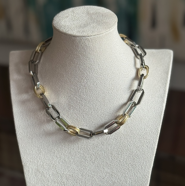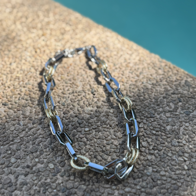 La elegancia de dos mundos en una sola joya. Este collar de eslabones combina la sofisticación moderna y brillante del Enchape en Rodio con la calidez atemporal de los detalles dorados. Su diseño bicolor lo convierte en el accesorio "comodín" definitivo: rompe las reglas, ilumina el rostro y combina perfectamente tanto con tus joyas de plata como con las de oro.