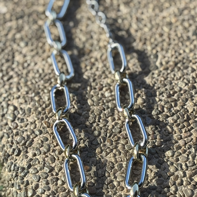 La elegancia de dos mundos en una sola joya. Este collar de eslabones combina la sofisticación moderna y brillante del Enchape en Rodio con la calidez atemporal de los detalles dorados. Su diseño bicolor lo convierte en el accesorio "comodín" definitivo: rompe las reglas, ilumina el rostro y combina perfectamente tanto con tus joyas de plata como con las de oro.