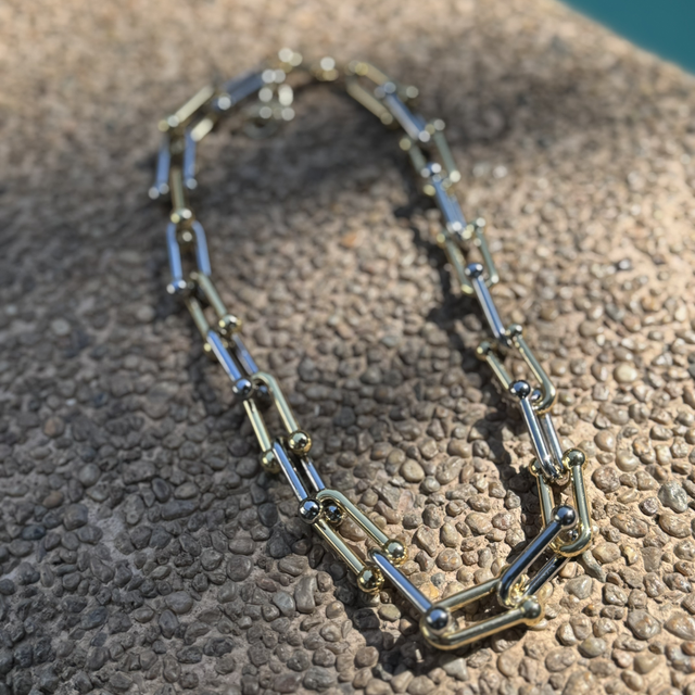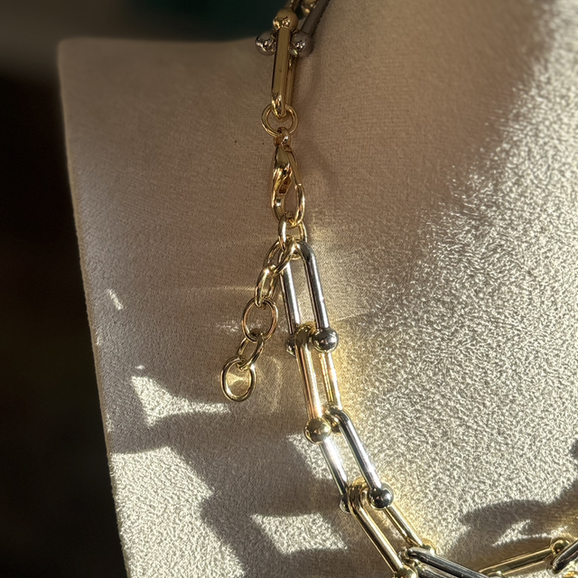 La elegancia de dos mundos en una sola joya. Este collar de eslabones combina la sofisticación moderna y brillante del Enchape en Rodio con la calidez atemporal de los detalles dorados. Su diseño bicolor lo convierte en el accesorio "comodín" definitivo: rompe las reglas, ilumina el rostro y combina perfectamente tanto con tus joyas de plata como con las de oro.