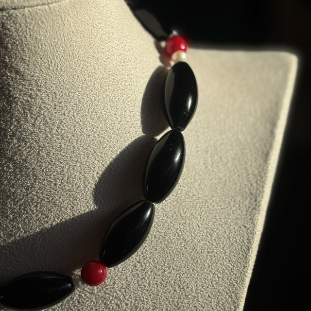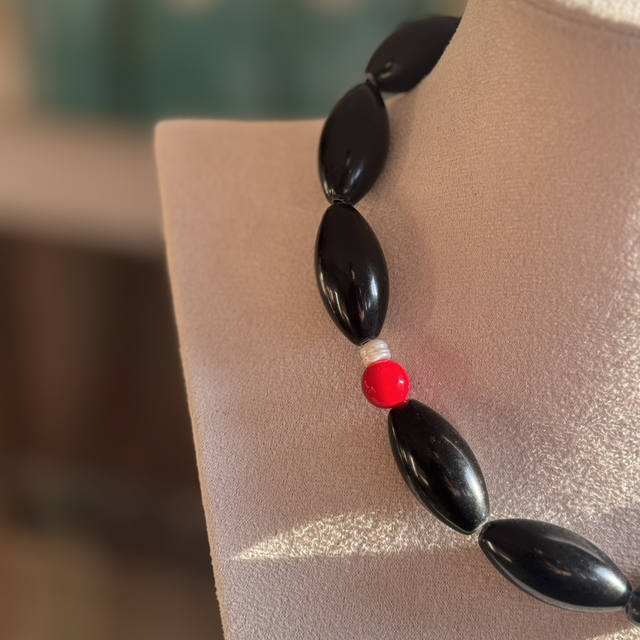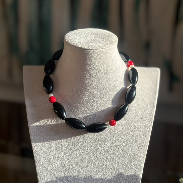 Atrévete con el contraste perfecto. Este collar combina la profundidad y elegancia de las ágatas negras con vibrantes toques de cristales rojos, creando una pieza llena de personalidad y fuerza visual. Su diseño de cuentas ovaladas aporta volumen sin perder sofisticación, ideal para ser el protagonista de un total black look o para dar vida a tonos neutros.